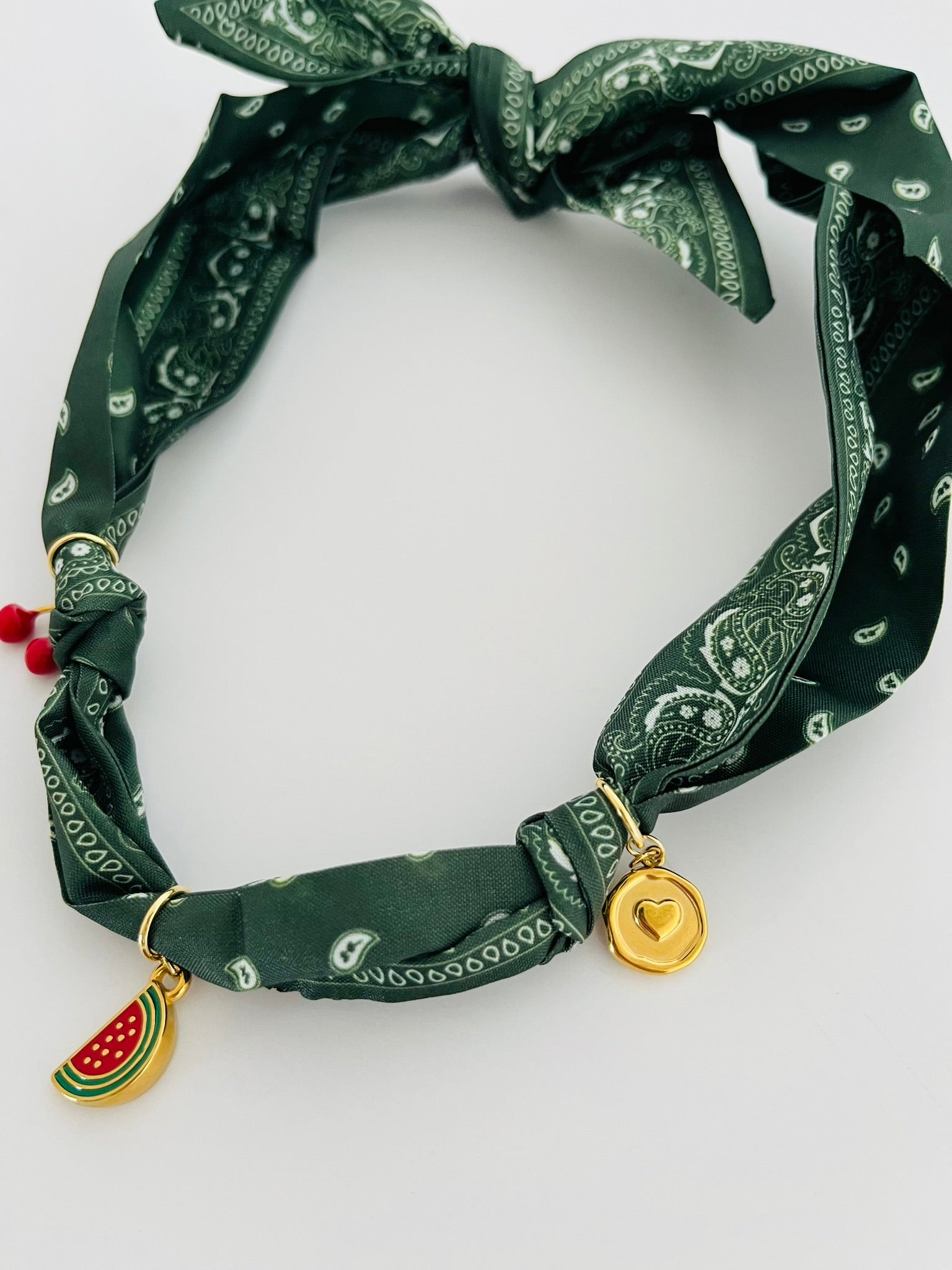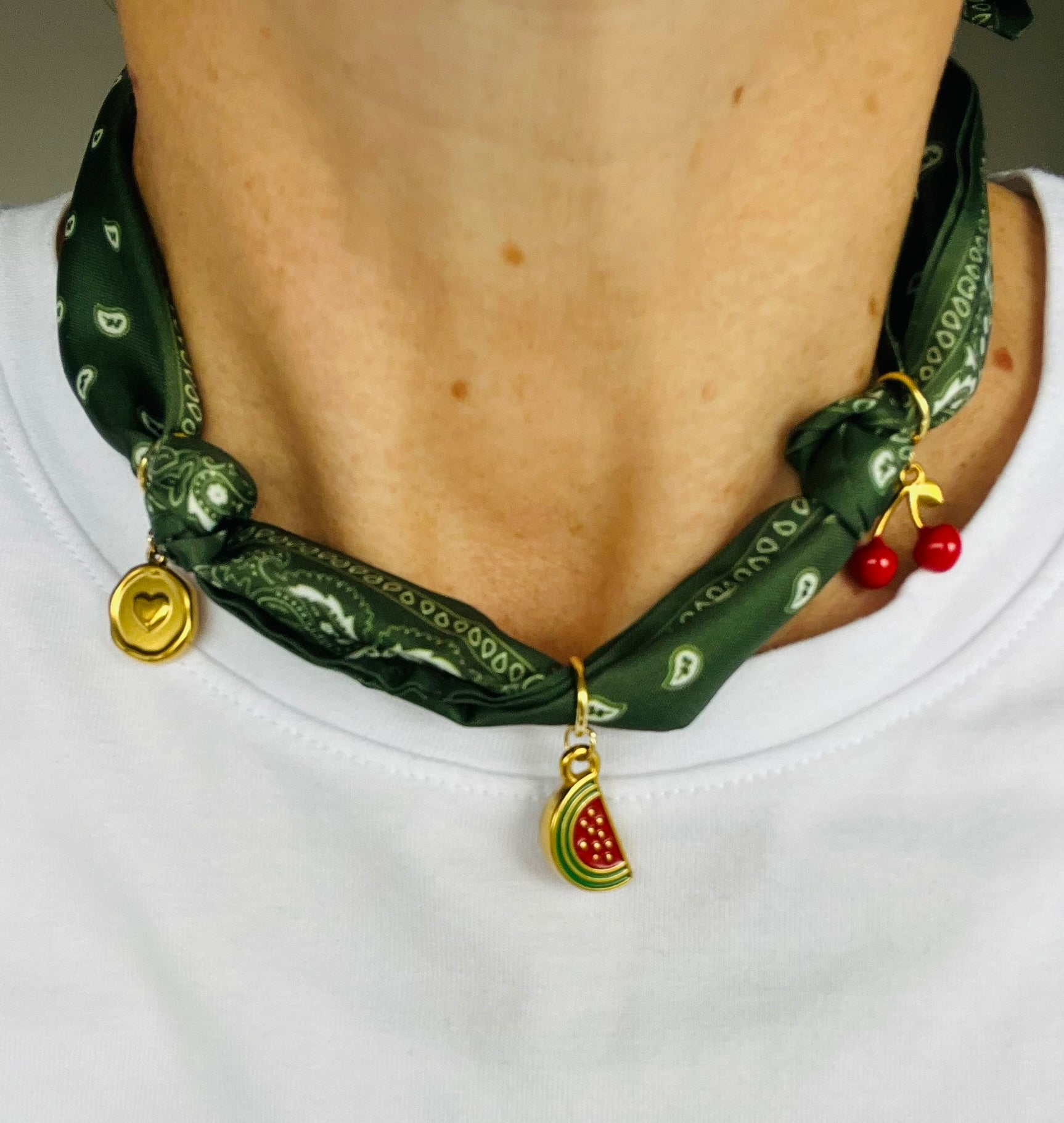 - Bandana necklace with stainless steel charms on a dark green classic bandana scarf necklace.