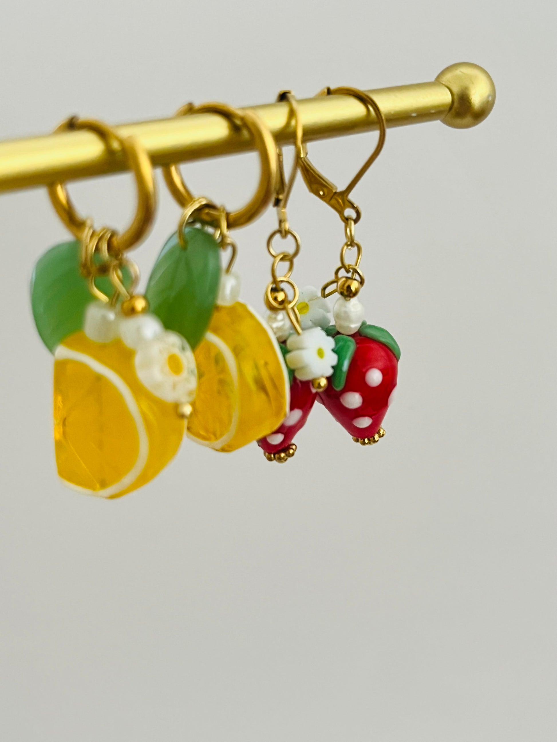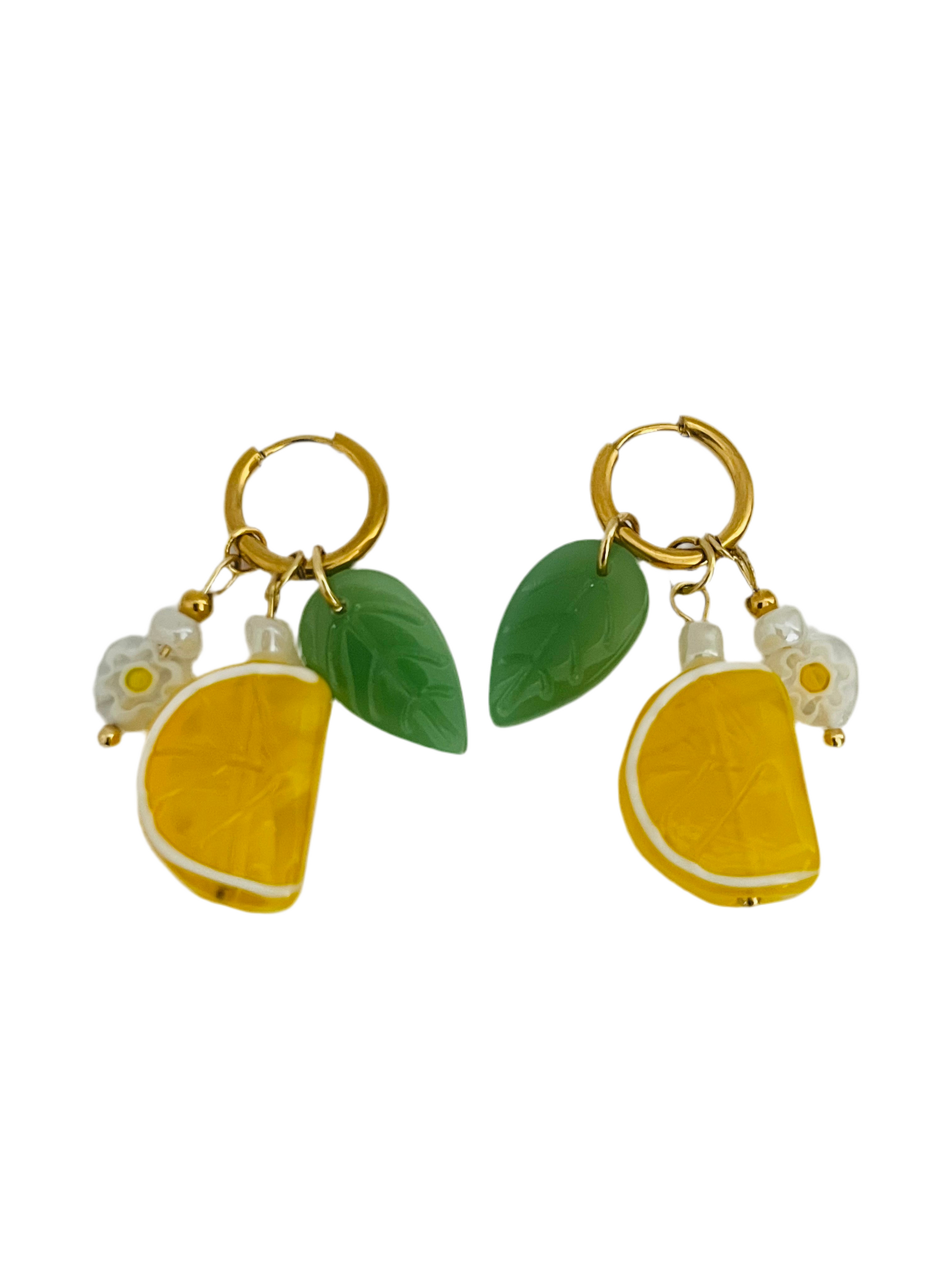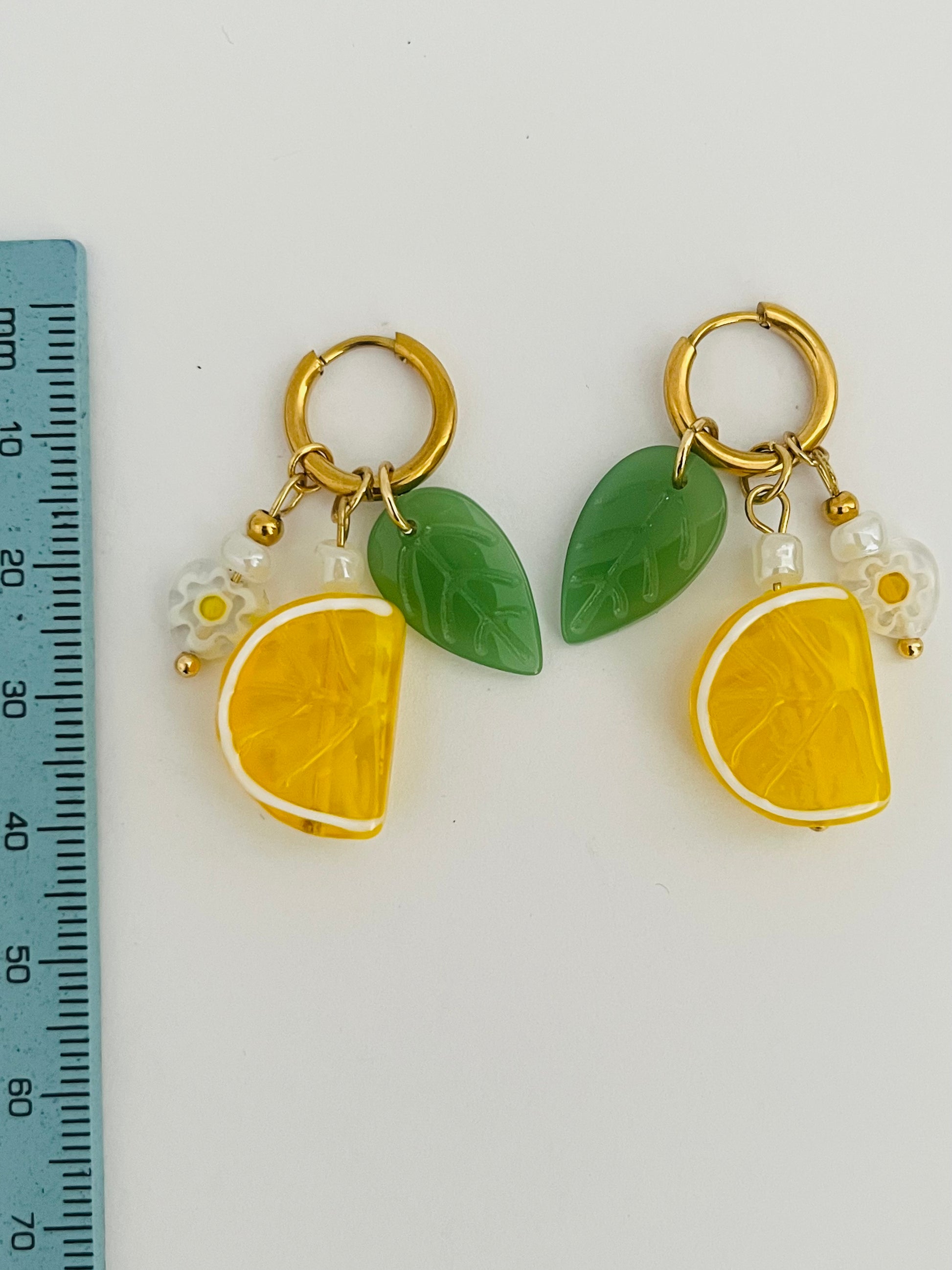 Bright and colourful lemon charm earrings. Lemon charms are made from glass with glass leaves on a 12 mm stainless steel hoop earring. 🍋