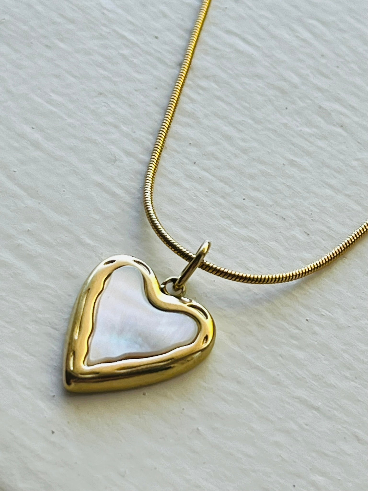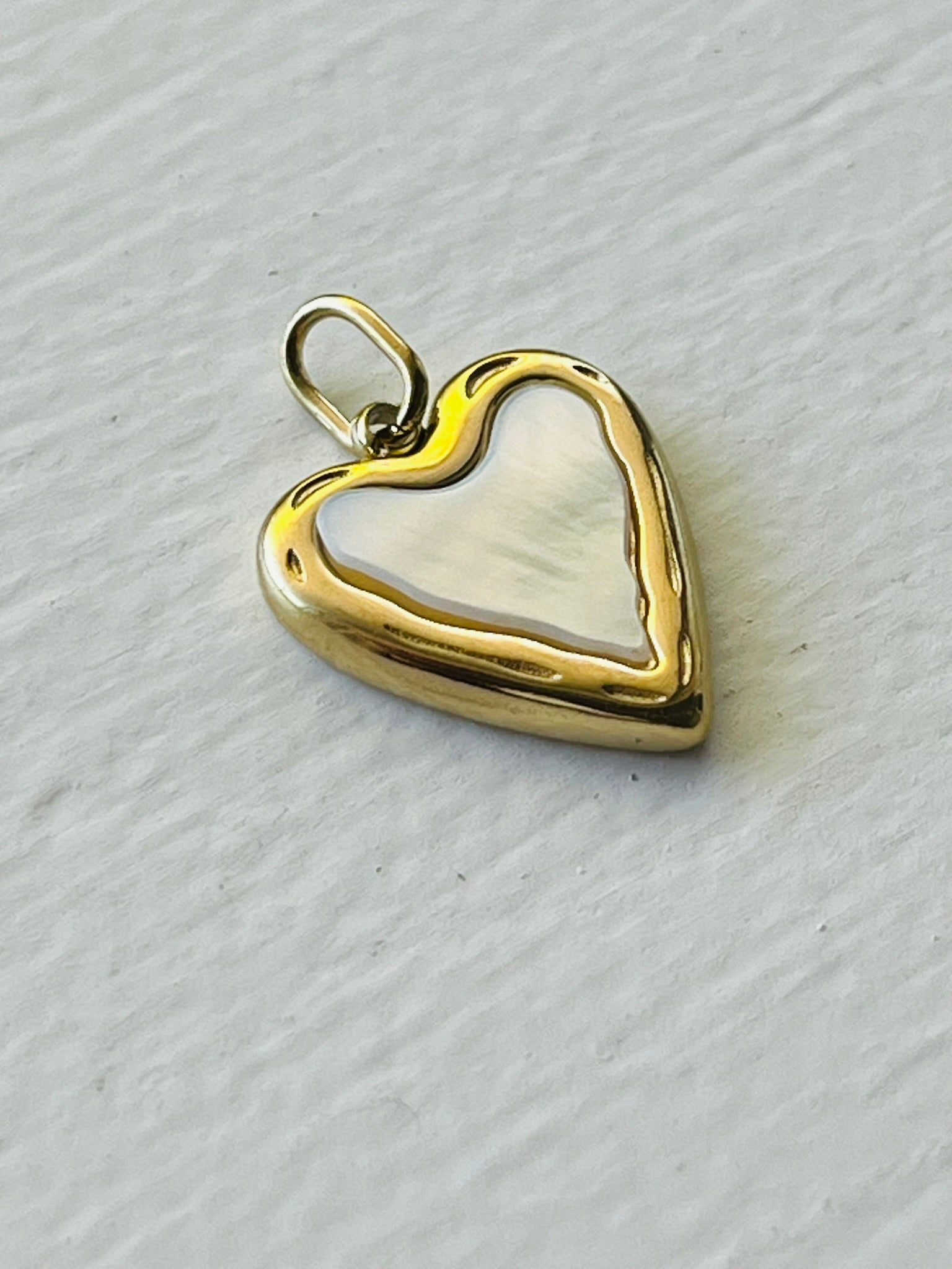 Heart charm with white shell inlaid. 13 mm long, 14 mm wide.