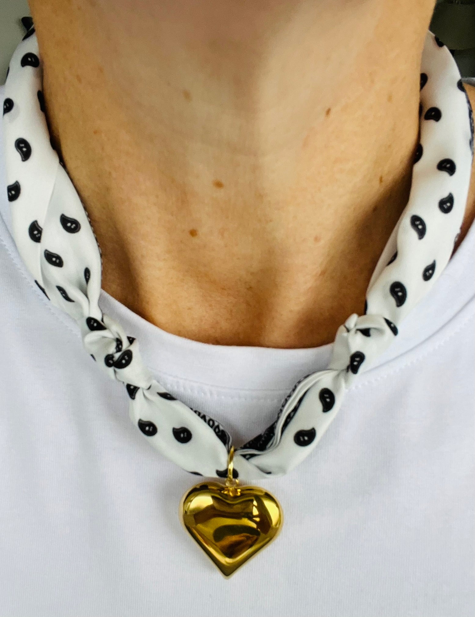 - Bandana necklace with big stainless steel heart charm on a white and black classic bandana scarf necklace.
