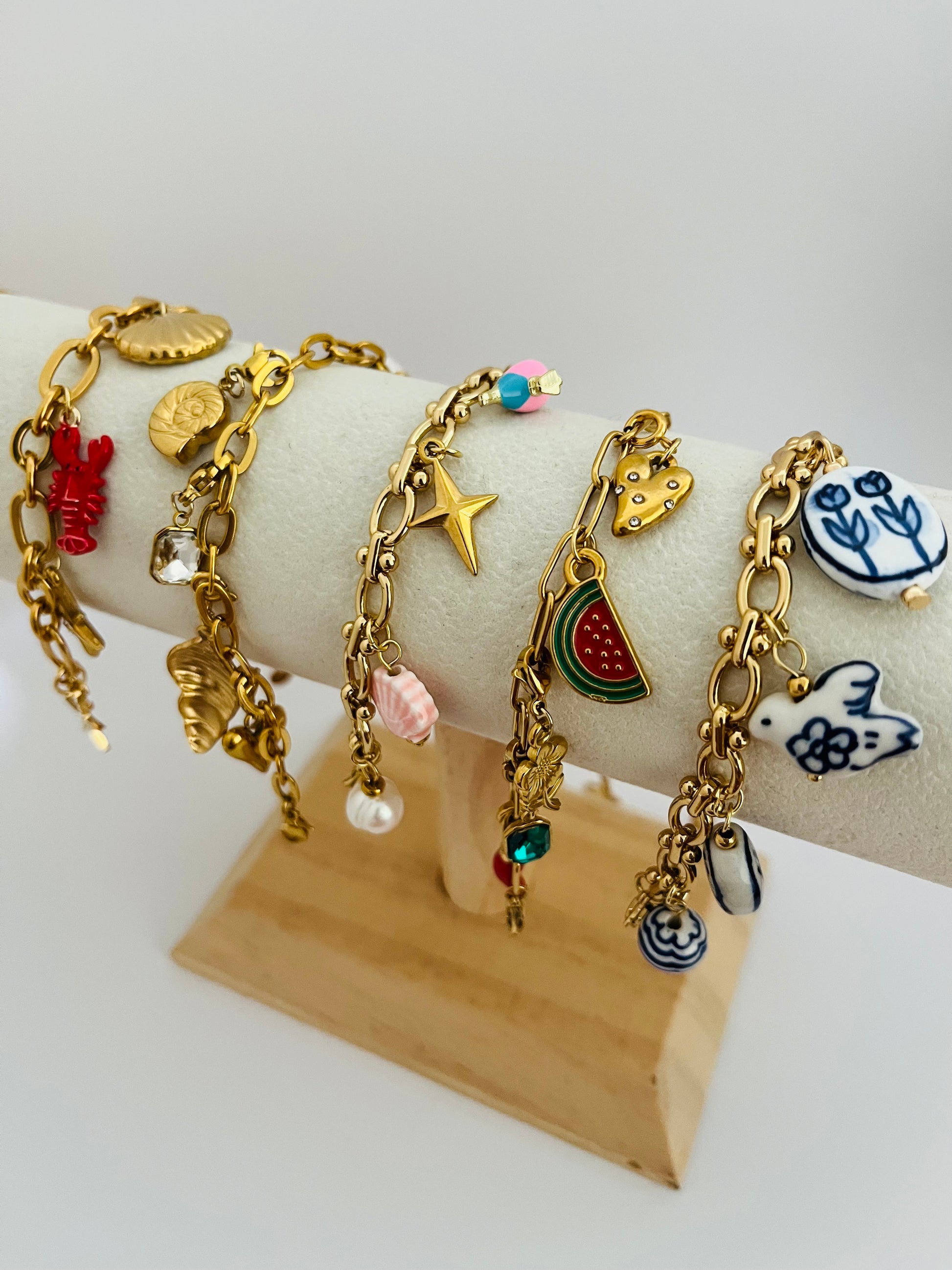 Chunky gold bracelet with 7 ocean inspired charms, including fresh water pearls.