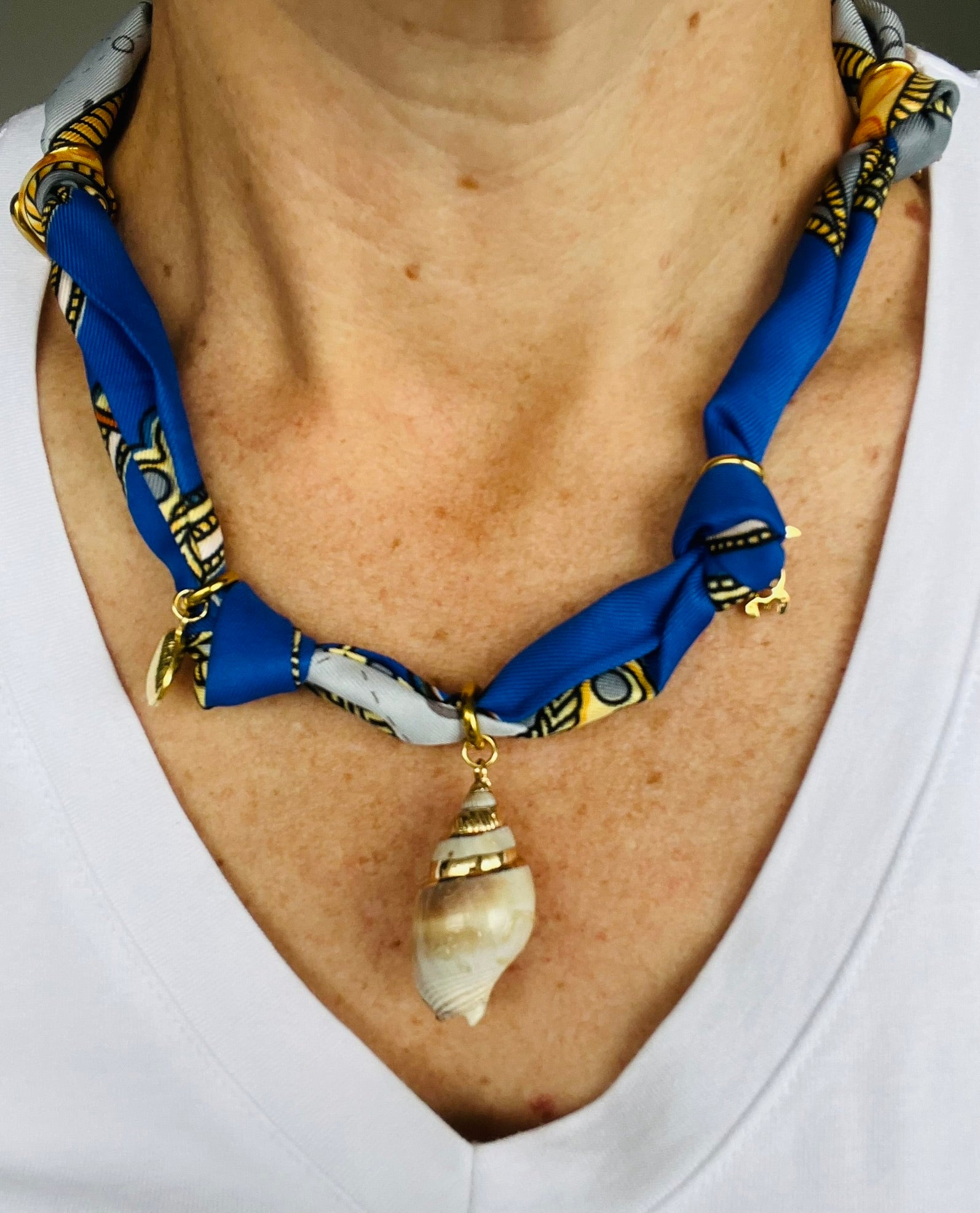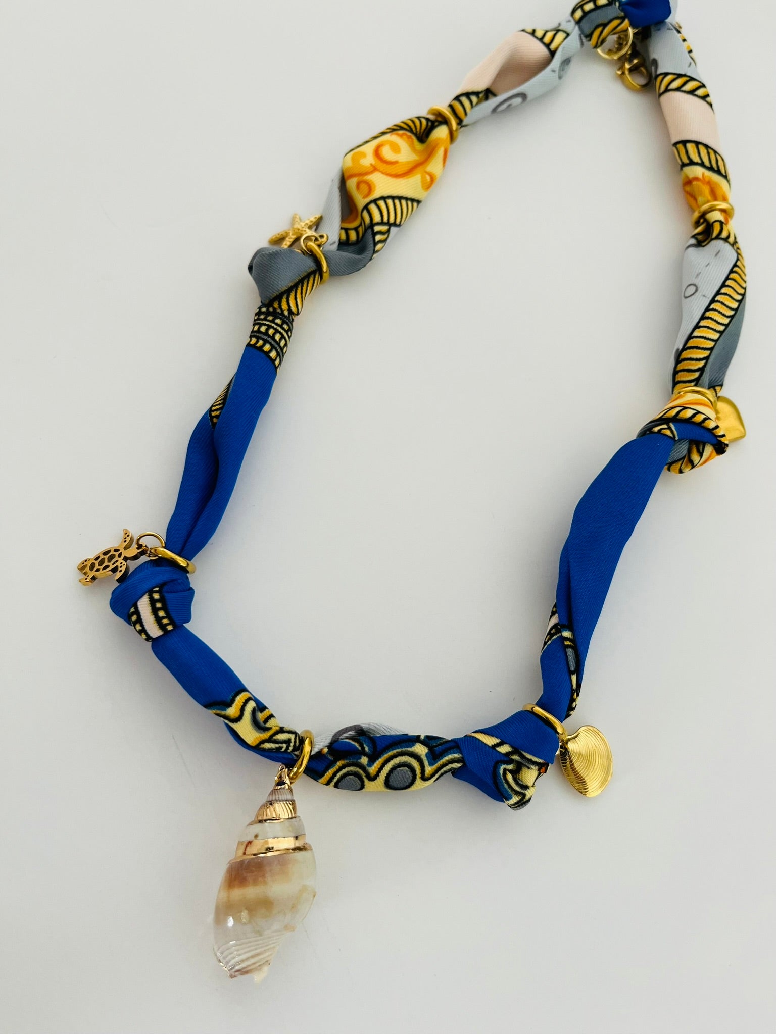 - Bandana necklace with shell and ocean inspired stainless steel charms on a blue and pattern soft scarf necklace.