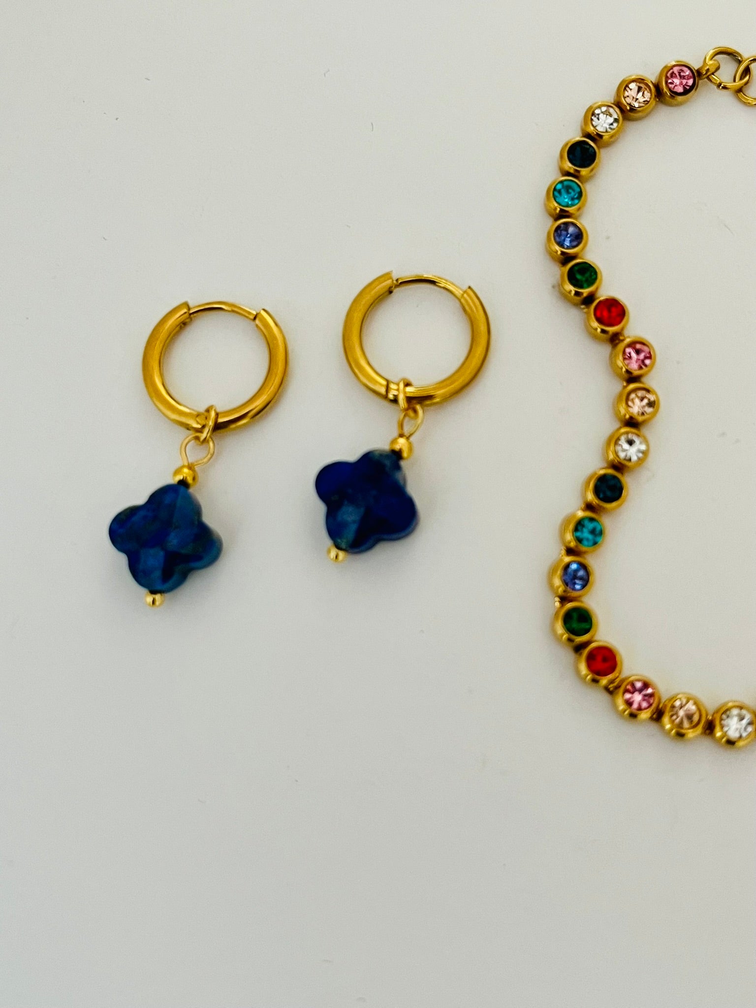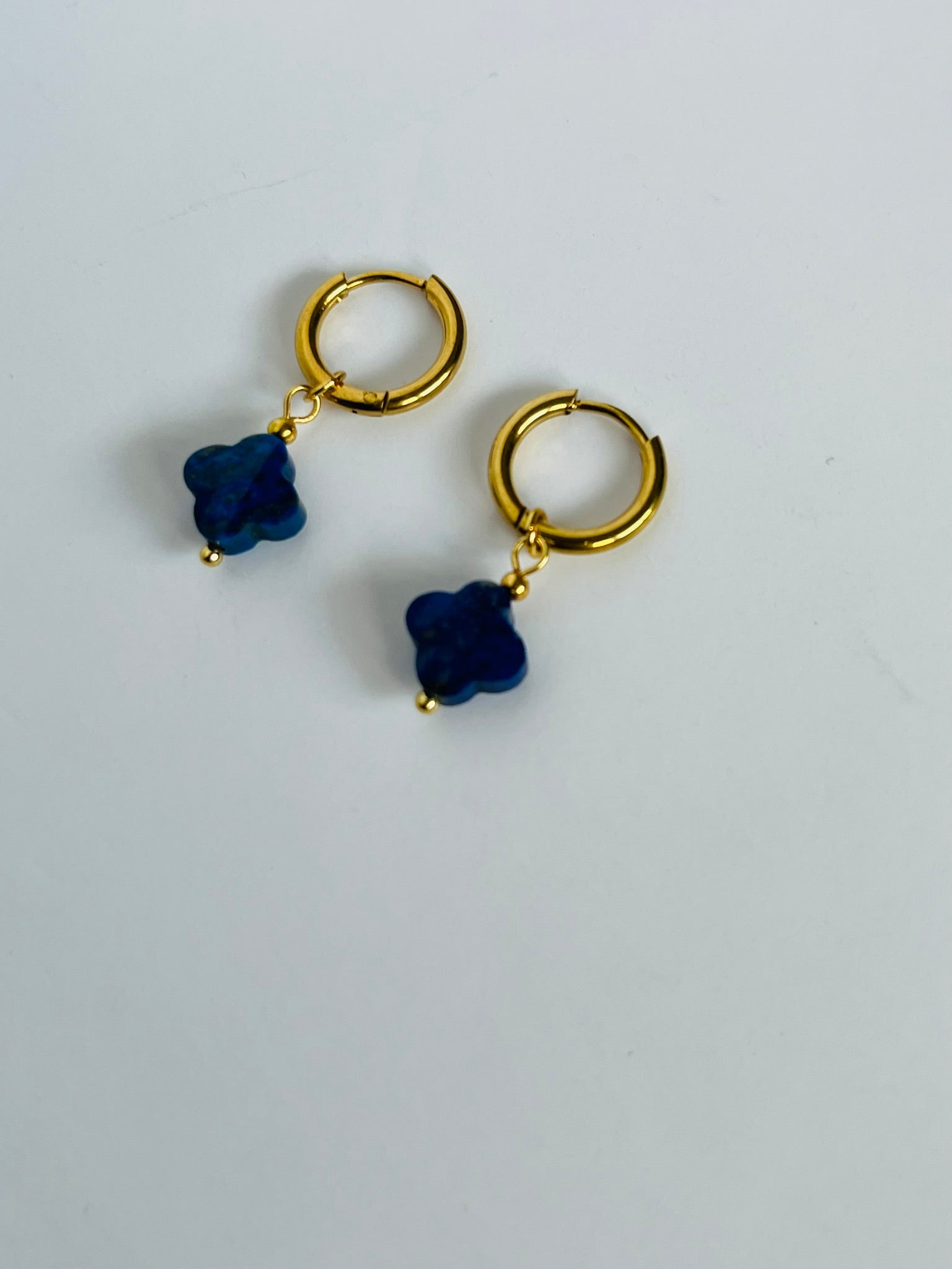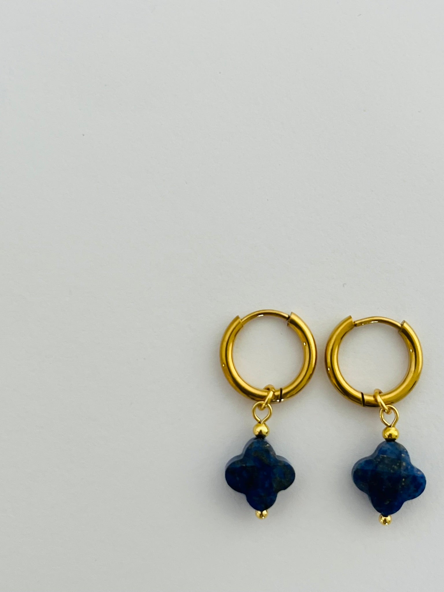 Bright blue Lapis Lazuli clover charm hoop earrings. Light and beautiful, these charm hoop earrings with the vintage inspired clover cut out, is ideal for any season or outfit.