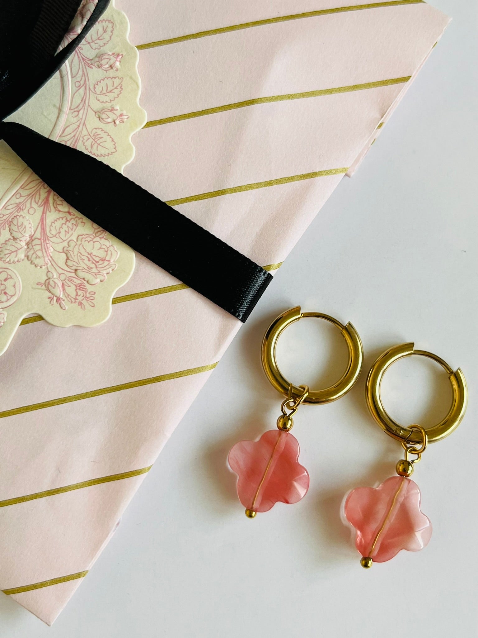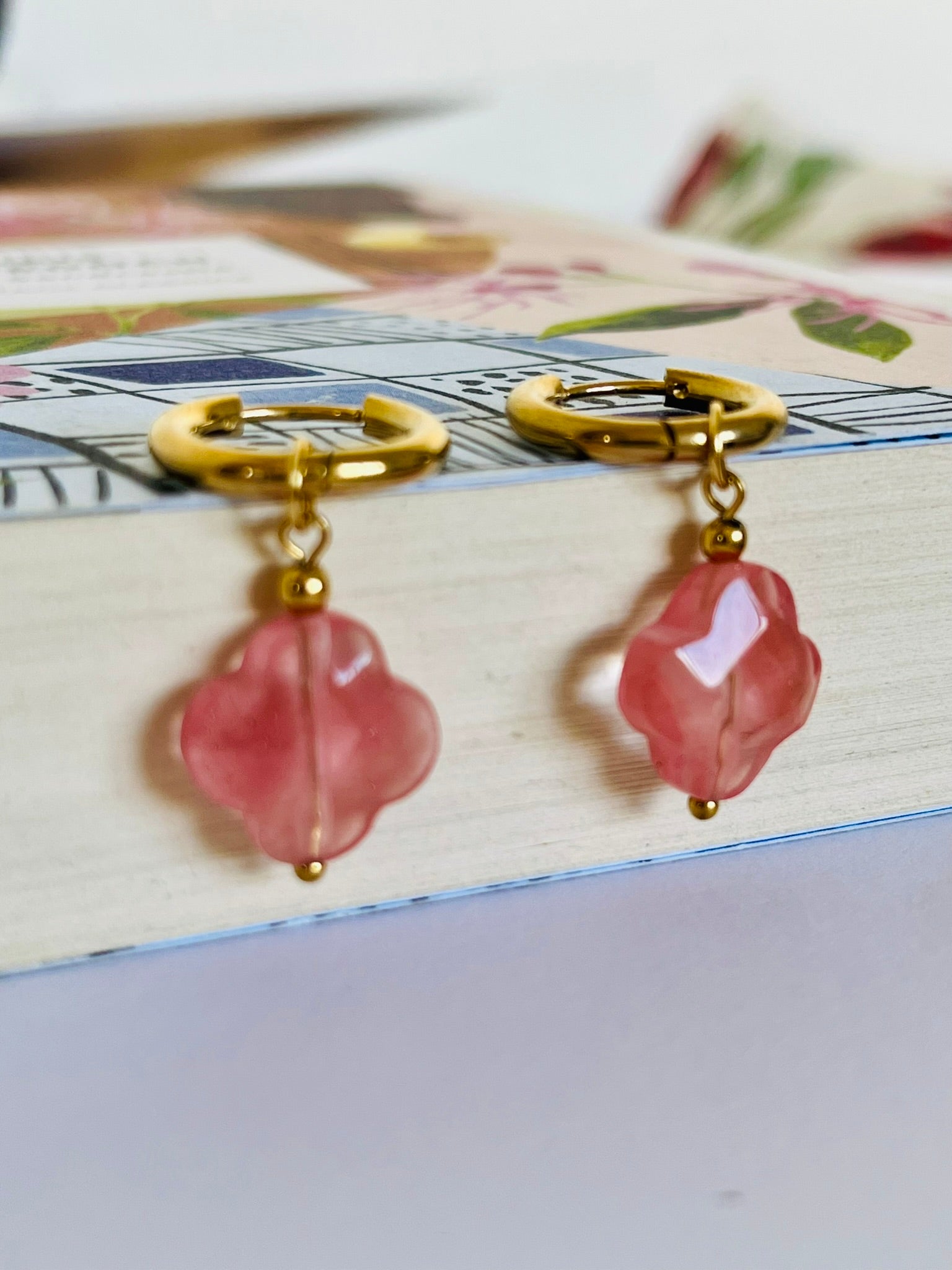 Rose quartz clover charm hoop earrings. Light and beautiful, these charm hoop earrings with the vintage inspired rose quartz clover cut out, is ideal for any season or outfit.