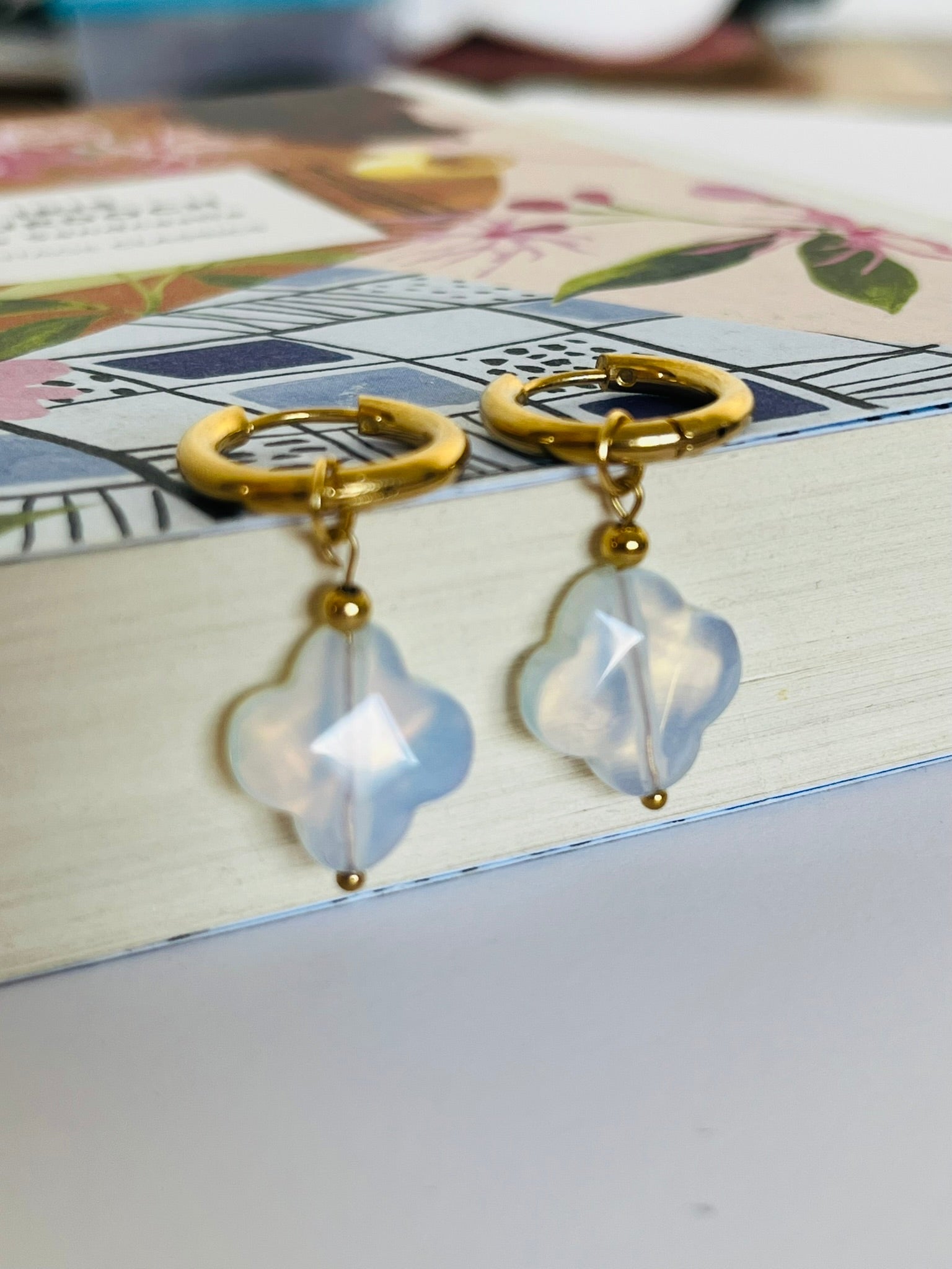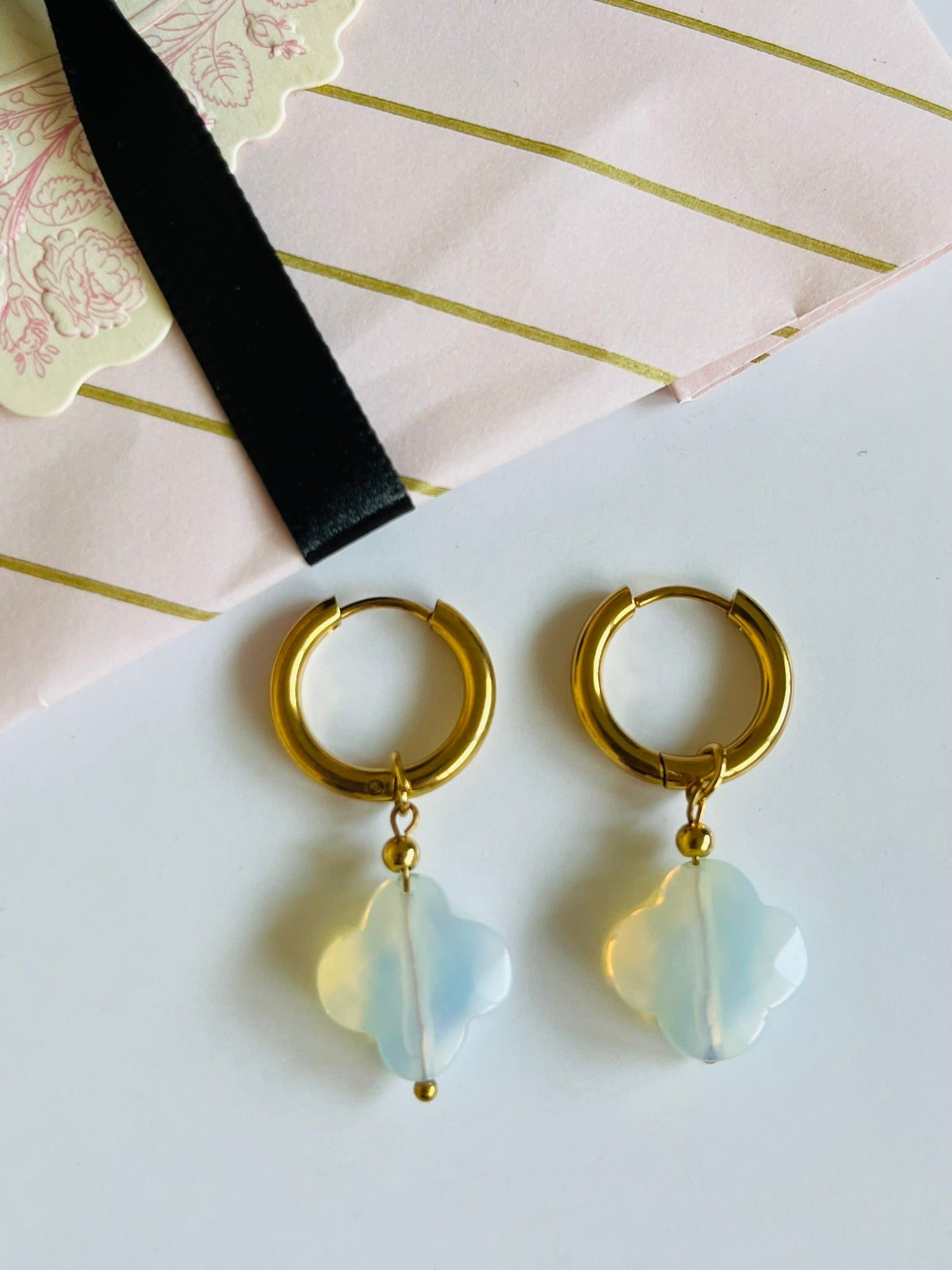 Opal clover charm hoop earrings. Light and beautiful, these charm hoop earrings with their vintage inspired opal clover cut out, is ideal for any season or outfit.